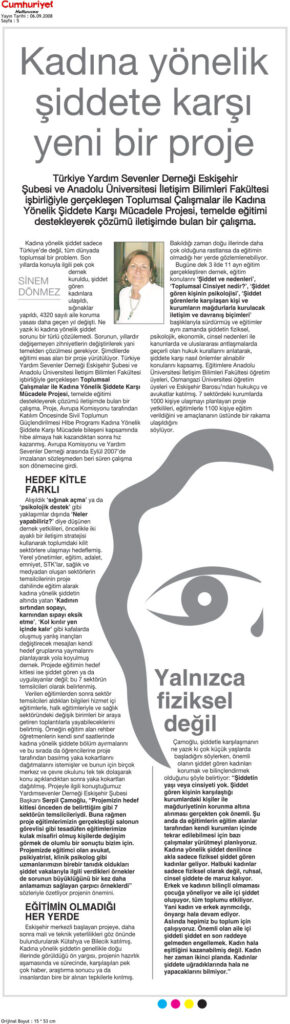 6 Eylül 2008 tarihinde Cumhuriyet gazetesinin 5. sayfasında yer alan Türkiye Yardım Sevenler Derneği Eskişehir Şubesi ve Anadolu Üniversitesi İletişim Bilimleri Fakültesi işbirliğiyle gerçekleşen Toplumsal Çalışmalar ile Kadına Yönelik Şiddete Karşı Mücadele Projesinin detaylarını içeren haberdir.
