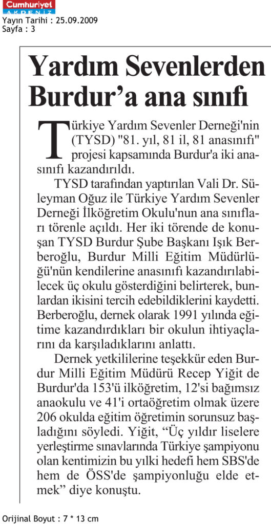 29 Eylül 2009 tarihinde Cumhuriyet gazetesinin 3. sayfasında yer alan Türkiye Yardım Sevenler Derneği’nin ”81. yıl, 81 il, 81 anasınıfı” projesi kapsamında Burdur’a kazandırılan iki anasınıfını içeren haberdir.