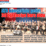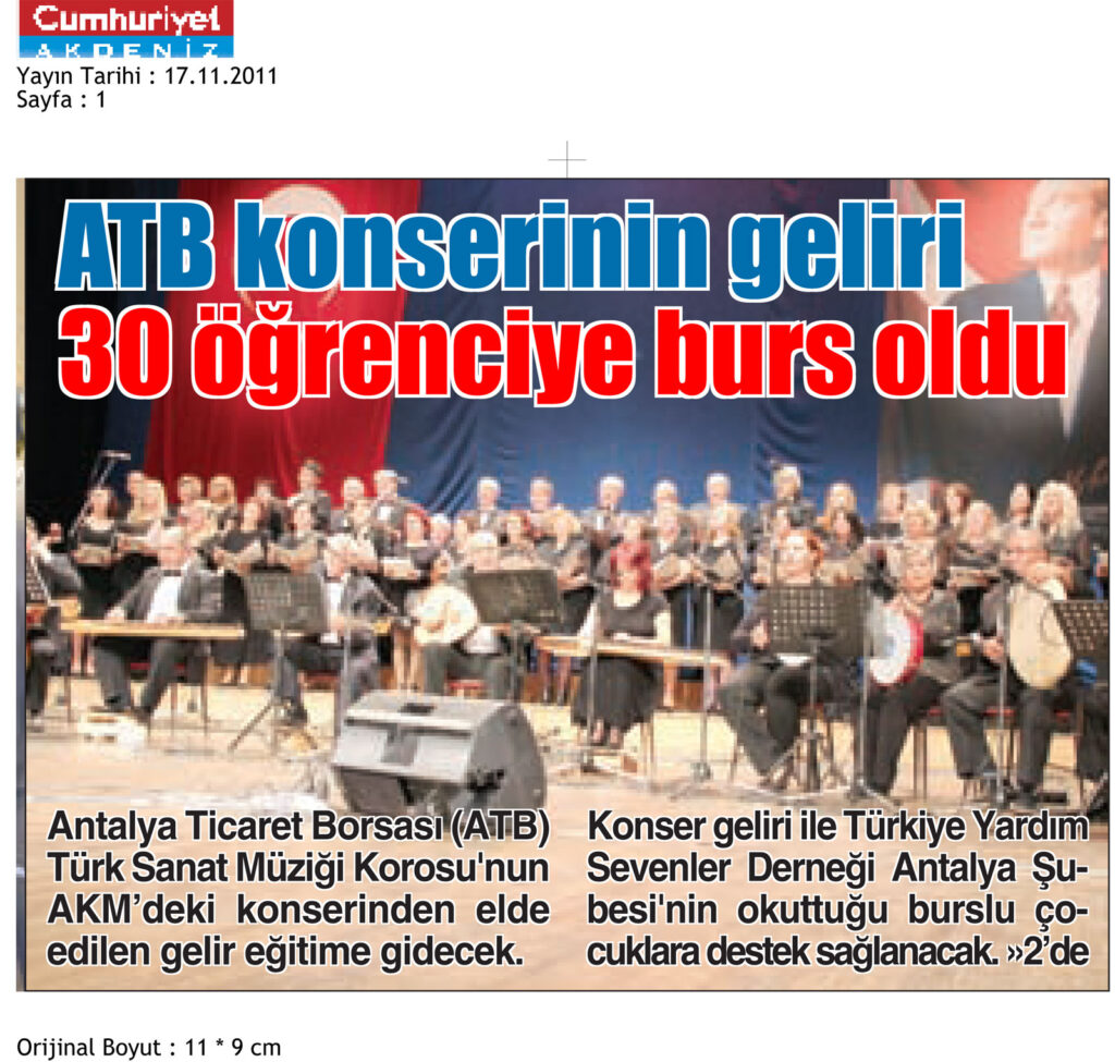 17 Kasım 2011 tarihinde Cumhuriyet gazetesinin 1. sayfasında yer alan haberde Antalya Ticaret Borsası Türk Sanat Müziği Korosu’nun AKM’deki konserinden elde edilen gelirin eğitime gideceği yer almaktadır. Gazetenin 2. sayfasında ise konserin 30 öğrenciye burs olduğu ifadelerine yer verilmiştir.