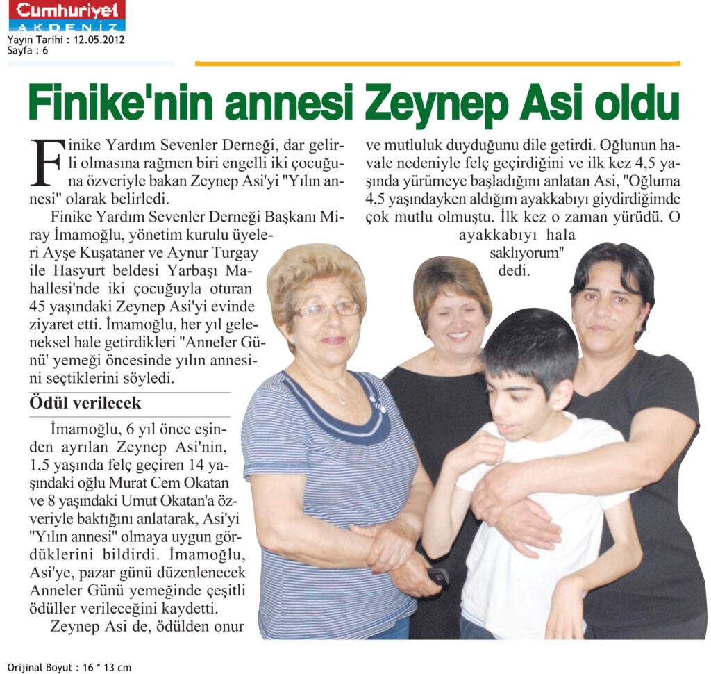 12 Mayıs 2012 tarihinde Cumhuriyet gazetesinin 6. sayfasında yer alan Finike Yardım Sevenler Derneği, dar gelirli olmasına rağmen biri engelli iki çocuğuna özveriyle bakan Zeynep Asi’yi “Yılın annesi” olarak belirlediği bilgisini içeren haberdir.