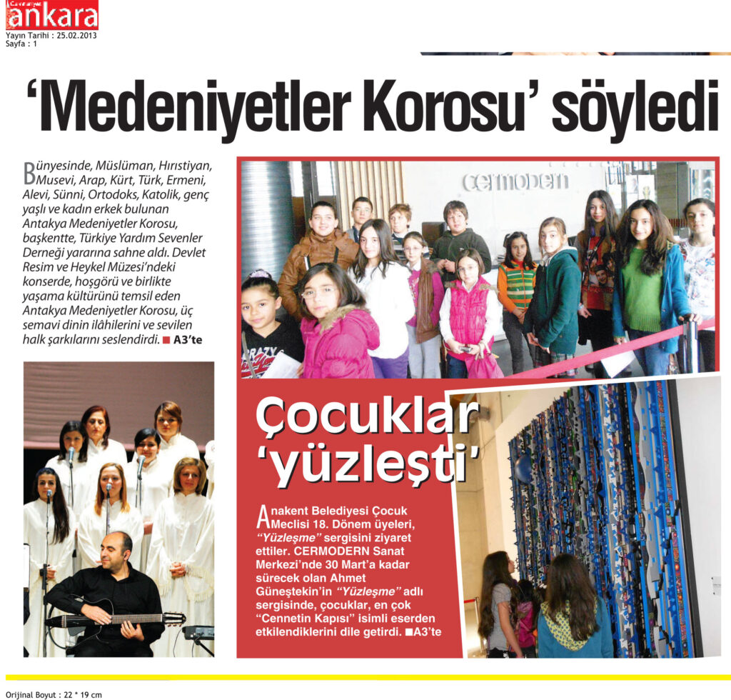 25 Şubat 2013 tarihinde Cumhuriyet gazetesinin 1. sayfasında yer alan haberde Antakya Medeniyetler Korosunun, başkentte, Türkiye Yardım Sevenler Derneği yararına sahne aldığı yer almaktadır. Gazetenin 3. sayfasında ise koro başkanı Yılmaz Özrıfat’ın ifadelerin yer almaktadır.