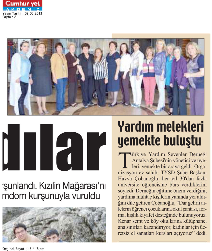 2 Mayıs 2013 tarihinde Cumhuriyet gazetesinin 8. sayfasında yer alan Yardım meleklerinin yemekte buluşmalarını içeren haberdir.