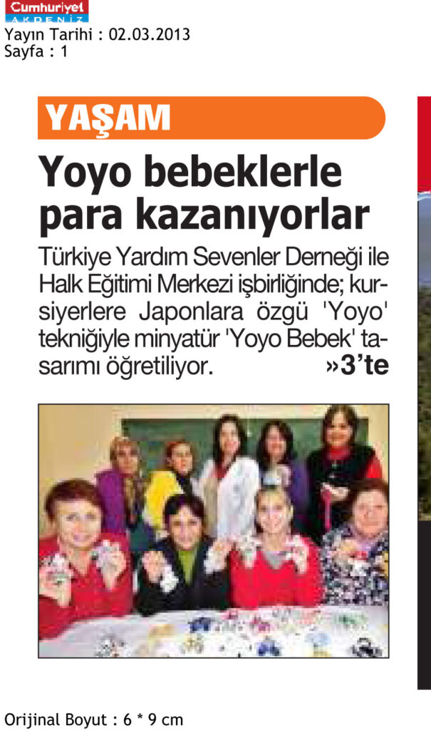 2 Mart 2013 tarihinde Cumhuriyet gazetesinin 1. sayfasında Japonlara özgü yoyo bebek tasarımının öğretildiği, 3 sayfasında ise bunları satarak para kazandıkları ile ilgili olan haberler yer almaktadır.