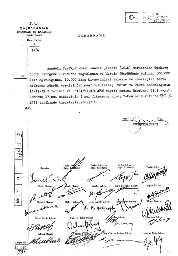 Anadolu Tasfiyehanesi Anonim Şirketi tarafından Çocuk Esirgeme Kurumu’na bağışlanan kereste ve ambalajlık tahtaların gümrük verigisinden muaf tutulmasını bildiren kararnamedir. Devlet Arşivleri Genel Müdürlüğü.