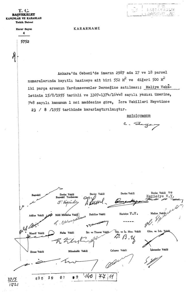 Ankara Cebeci’de imarın 2987 ada 17 ve 18 parsel numaralı hazineye ait 2 arsanın Yardım Sevenler Derneği’ne satılması kararının alındığı belgedir. Başbakanlık.