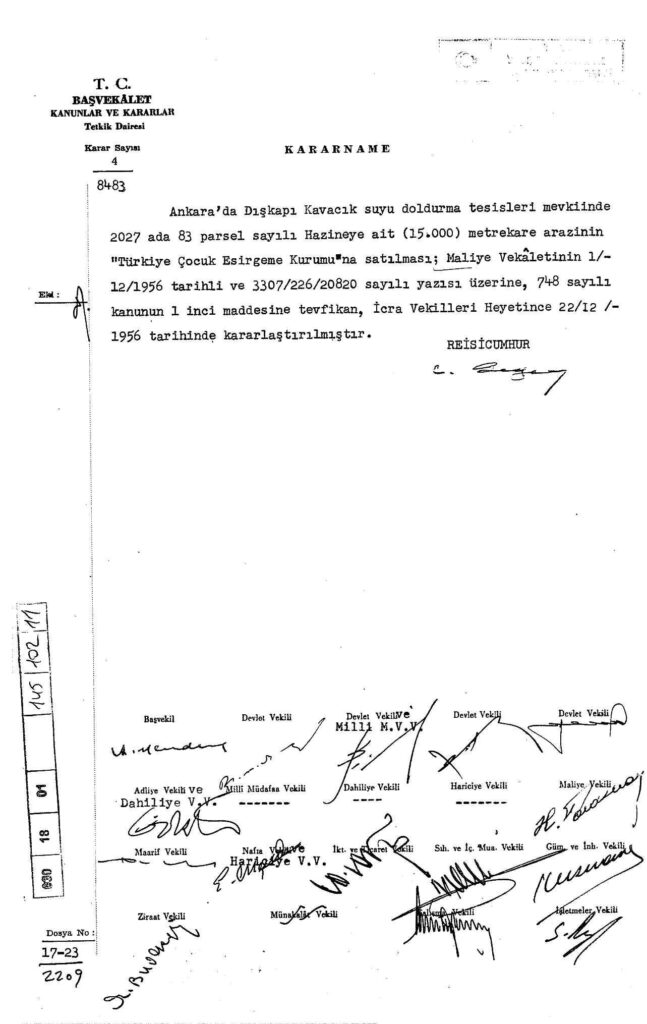 Ankara Dışkapı arazisinin Çocuk Esirgeme Kurumu’na satılmasının kararlaştırıldığını bildiren kararnamedir. Devlet Arşivleri Genel Müdürlüğü.