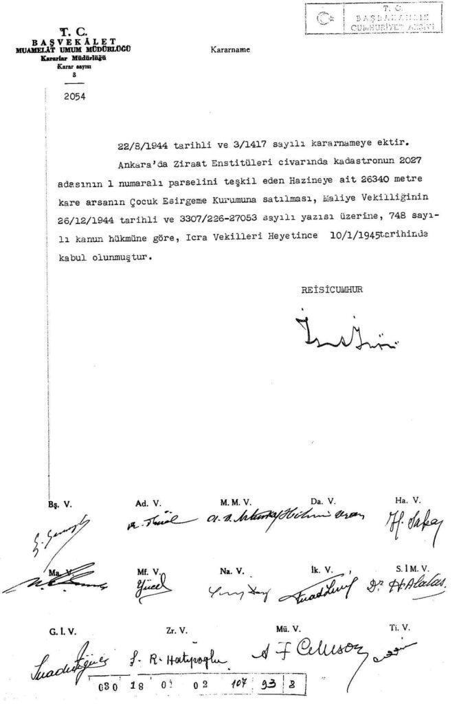 Ankara Ziraat Enstitüsü civarındaki Hazineye ait arsanın Çocuk Esirgeme Kurumu’na satılmasının kabul edildiğini bildiren kararnamedir. Devlet Arşivleri Genel Müdürlüğü.