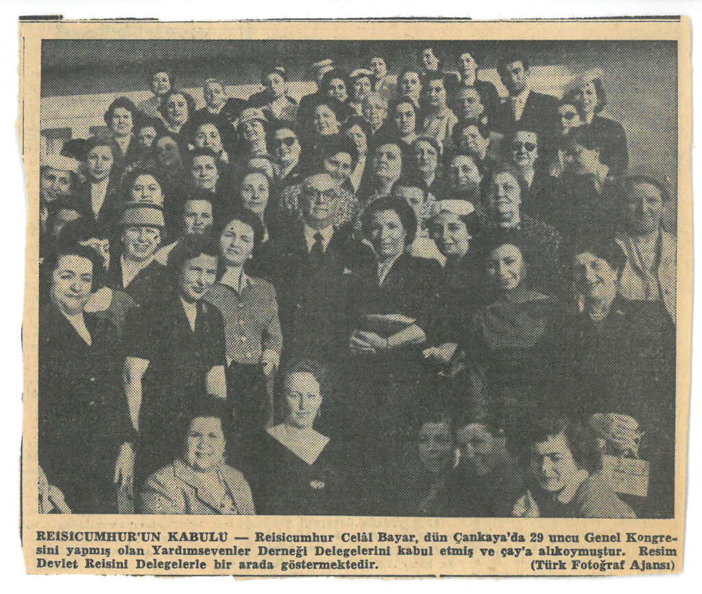 Cumhurbaşkanı Celal Bayar Çankaya da 29. Genel Kongresini yapmış olan Yardım Sevenler Derneği delegelerini kabul ettiğini özetleyen bir fotoğraf yer almaktadır. Türk Fotoğraf Ajansı.