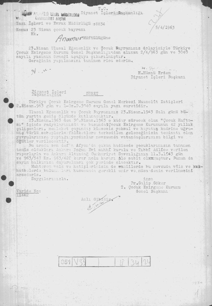 Çocuk Bayramı’nın tüm yurtta geniş ölçüde kutlandığını bildiren belgelerdir. Devlet Arşivleri Genel Müdürlüğü.