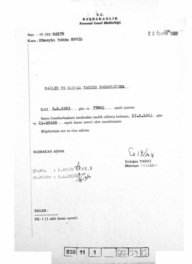 Öğretmen Hüseyin Tekin Sevil’in Çocuk Esirgeme Kurumu’na tayin olmasındaki süreçte oluşan belgelerdir. Devlet Arşivleri Genel Müdürlüğü.