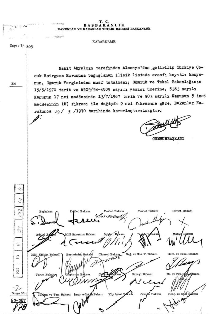 Nahit Akyalçın tarafından Almanya’dan getirilip Çocuk arazinin Türkiye Çocuk Esirgeme Kurumu’na bağışlanan kamyon’un gümrük vergisinden muaf tutulmasına karar verildiği kararnamedir. Devlet Arşivleri Genel Müdürlüğü.