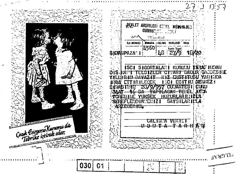 Çocuk Esirgeme Kurumu’nun Adnan Menderes’i yeni açılacak hastanenin temel atma törenine davet etmesini ve tebrik telgraflarını sunduğunu bildiren belgelerdir. Çocuk Esirgeme Kurumu.