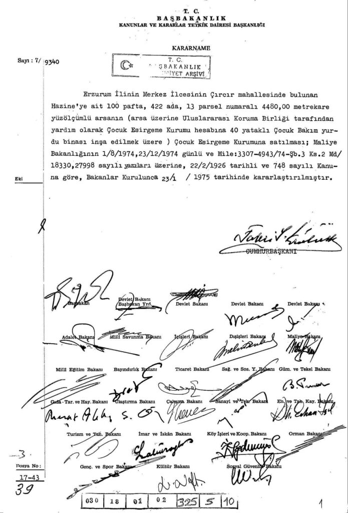 Erzurum’un Çirçir Mahallesi’nde bulunan hazineye ait arsanın Çocuk Bakım Yurdu inşaa edilmek üzere Çocuk Esirgeme Kurumu’na satılmasına karar verilen belgelerdir. Devlet Arşivleri Genel Müdürlüğü.