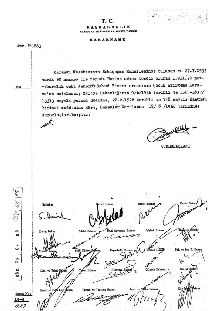 Karaman Kasabasında bulunan ve tapuda hazine adına tasdik olunan eski Askerlik Şubesi binasının Çocuk Esirgeme Kurumu’na satılması kararının alındığı kararname yer almaktadır.