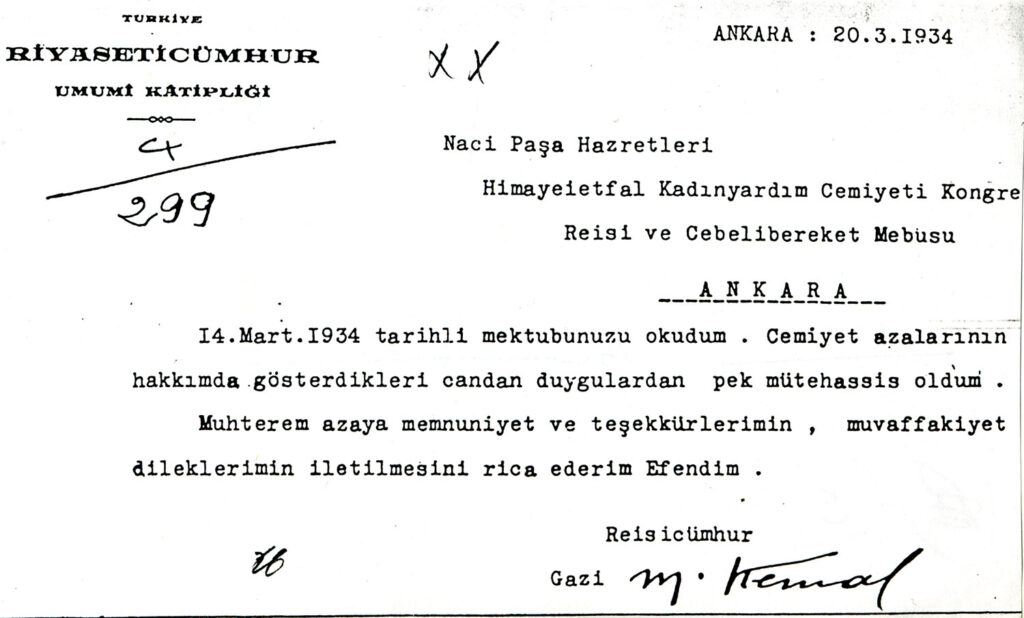 Gazi Mustafa Kemal Atatürk’ün Himaye-i Etfal Kadın Yardım Cemiyeti’ne teşekkürlerini ilettiği yazı yer almaktadır.