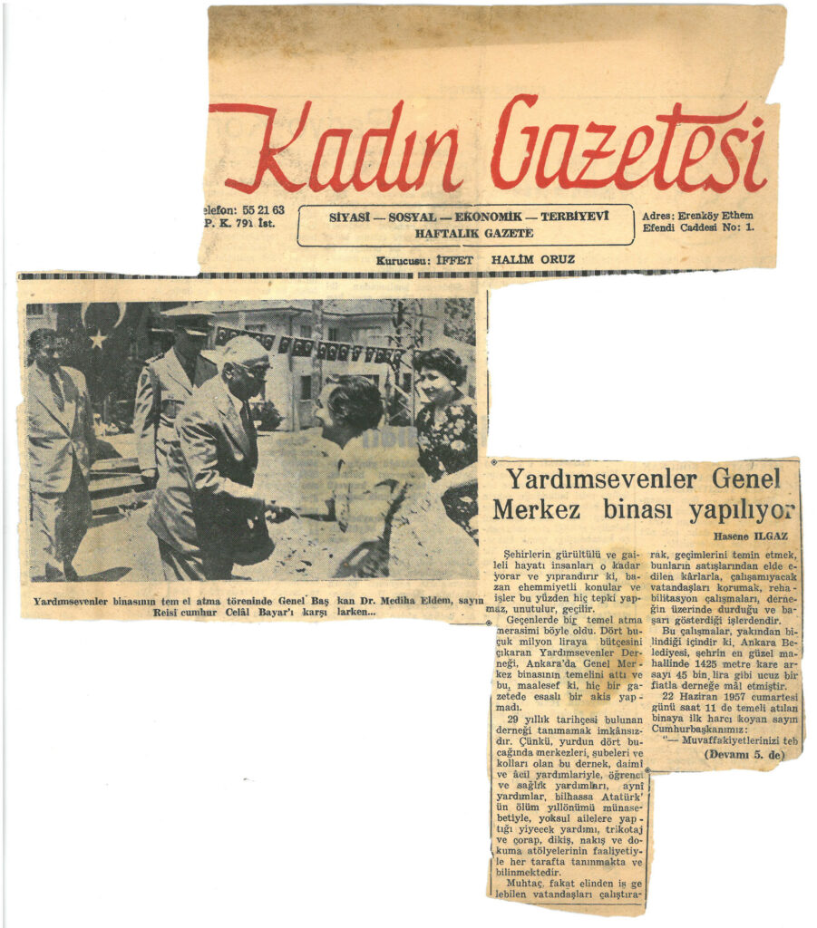 Kadın Gazetesinde Yardım Sevenler Derneği Genel Merkez İnşaatı temel atma töreni ile ilgili olan haberde Mediha Eldem’in Celal Bayar’ı karşılamış olduğu bir fotoğrafta yer almıştır. Kadın Gazetesi.