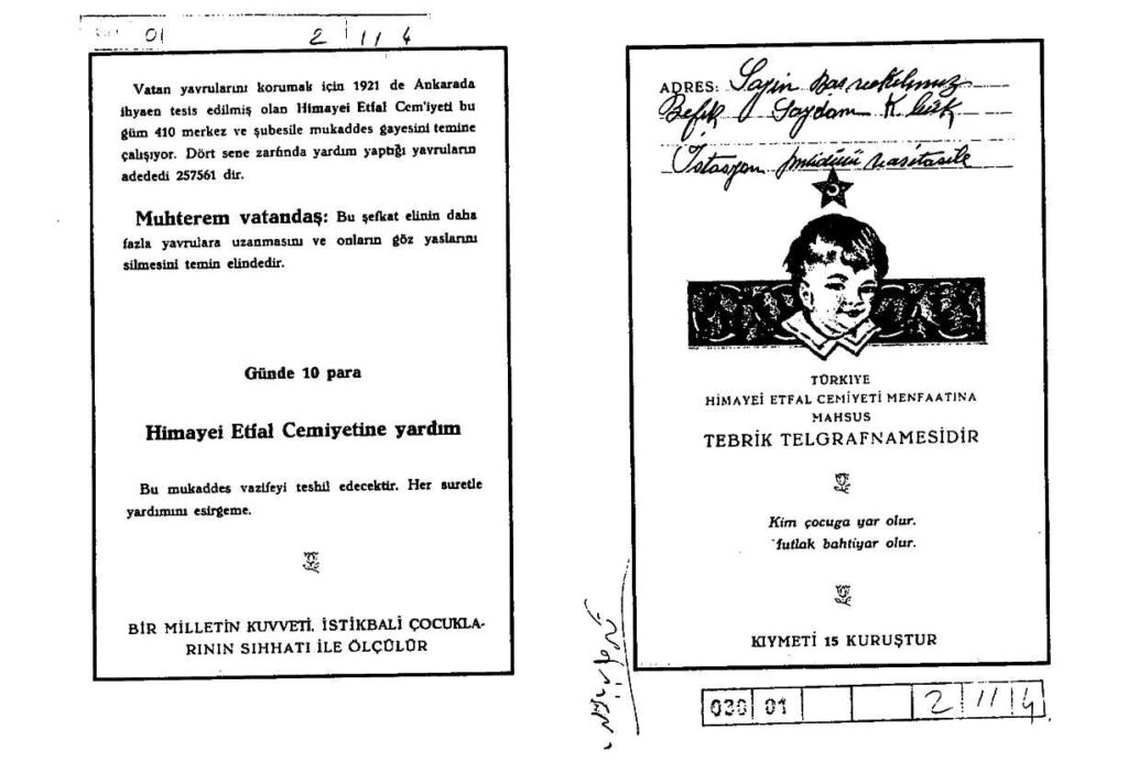 Himaye-i Etfal Cemiyeti Karabük şubesinin yardım isteğinde bulunduğu tebrik telgrafnamesi yer almaktadır.