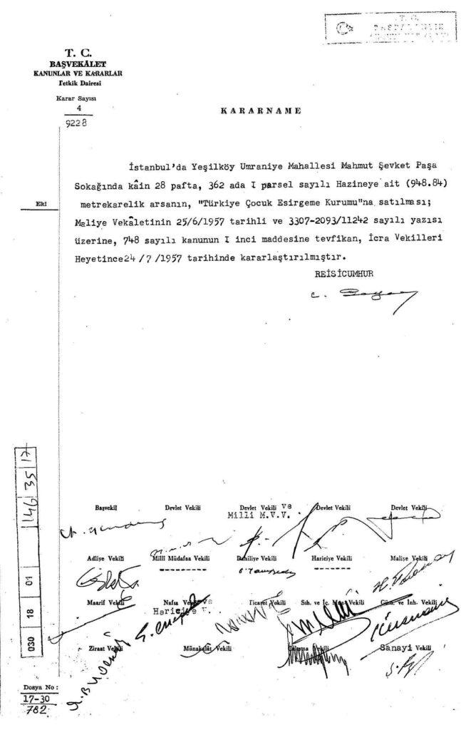 İstanbul’da Yeşilköy Ümraniye mahallesinde 948.48 metrekarelik arazinin Türkiye Çocuk Esirgeme Kurumu’na satılmasına karar verildiği kararnamedir. Devlet Arşivleri Genel Müdürlüğü.