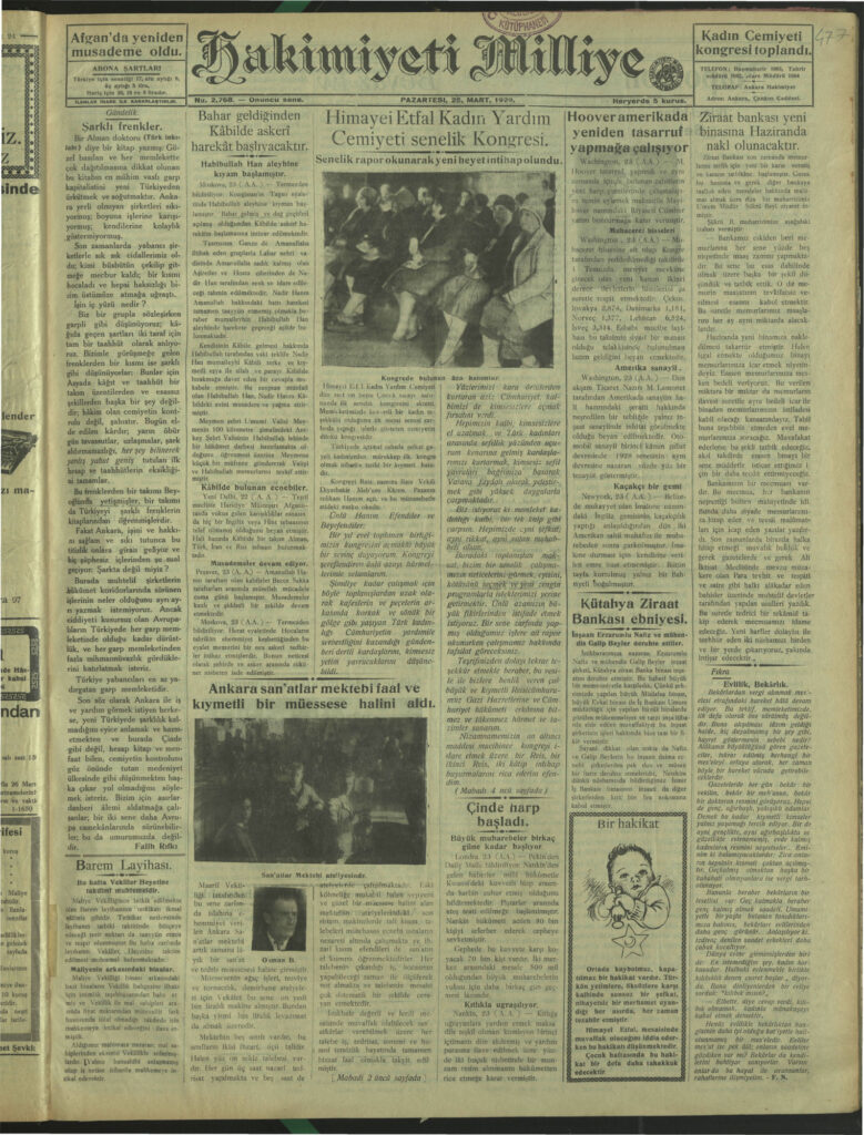 22 Mart 1929 ve 25 Mart 1929 tarihlerinde Hakimiyeti Milliye Gazetesi’nde yer alan Kongreye davet çağrısını ve Himayei Etfal Kadın Yardım Cemiyeti’nin Senelik Kongresi’nde Kazım Bey’in eşinin yaptığı konuşmayı ifade eden haberlerdir. Hakimiyeti Milliye Gazetesi.