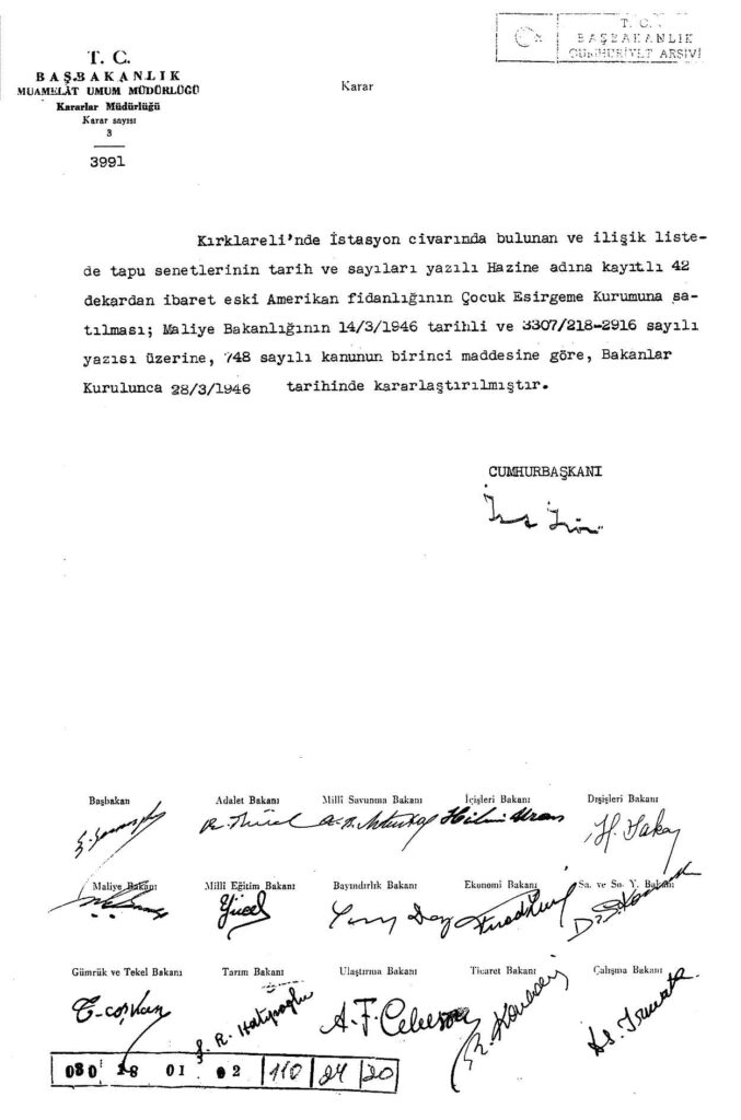 Kırklareli’nde 42 dekar’dan ibaret eski Amerikan Fidanlığı arazinin Türkiye Çocuk Esirgeme Kurumu’na satılmasına karar verildiği kararname ve tapu senetlerinin tarih ve sayıları’nın yer aldığı bir liste yer almaktadır. Devlet Arşivleri Genel Müdürlüğü.