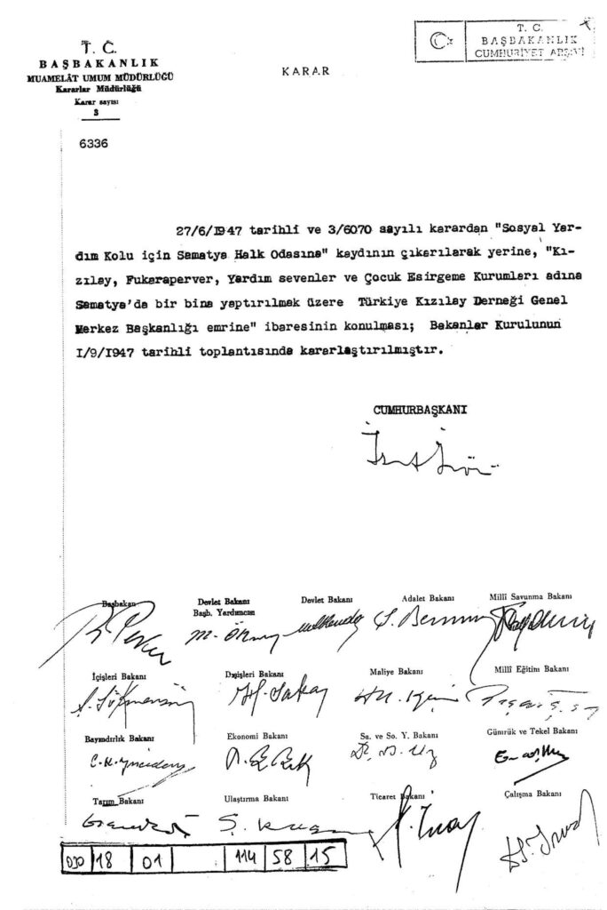 Kızılay, Fukaraperver, Yardım Sevenler ve Çocuk Esirgeme Kurumları adına Samatya’da bir bina yaptırmak üzere alınan kararı içermektedir. Türkiye Yardım Sevenler Derneği.