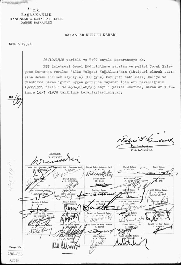 PTT İşletmesi Genel Müdürlüğü’nce satılan ve geliri Çocuk Esirgeme Kurumu’na verilen Lüks Telgraf Kağıtları’nın 100 kuruştan satılmasına karar verilen kararnamedir.