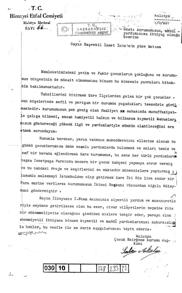 Malatya Çocuk Esirgeme Kurumu Başkanının Başvekil İsmet İnönü’ye maddi yardım talebinde bulunduğu belge yer almaktadır. Devlet Arşivleri Genel Müdürlüğü.