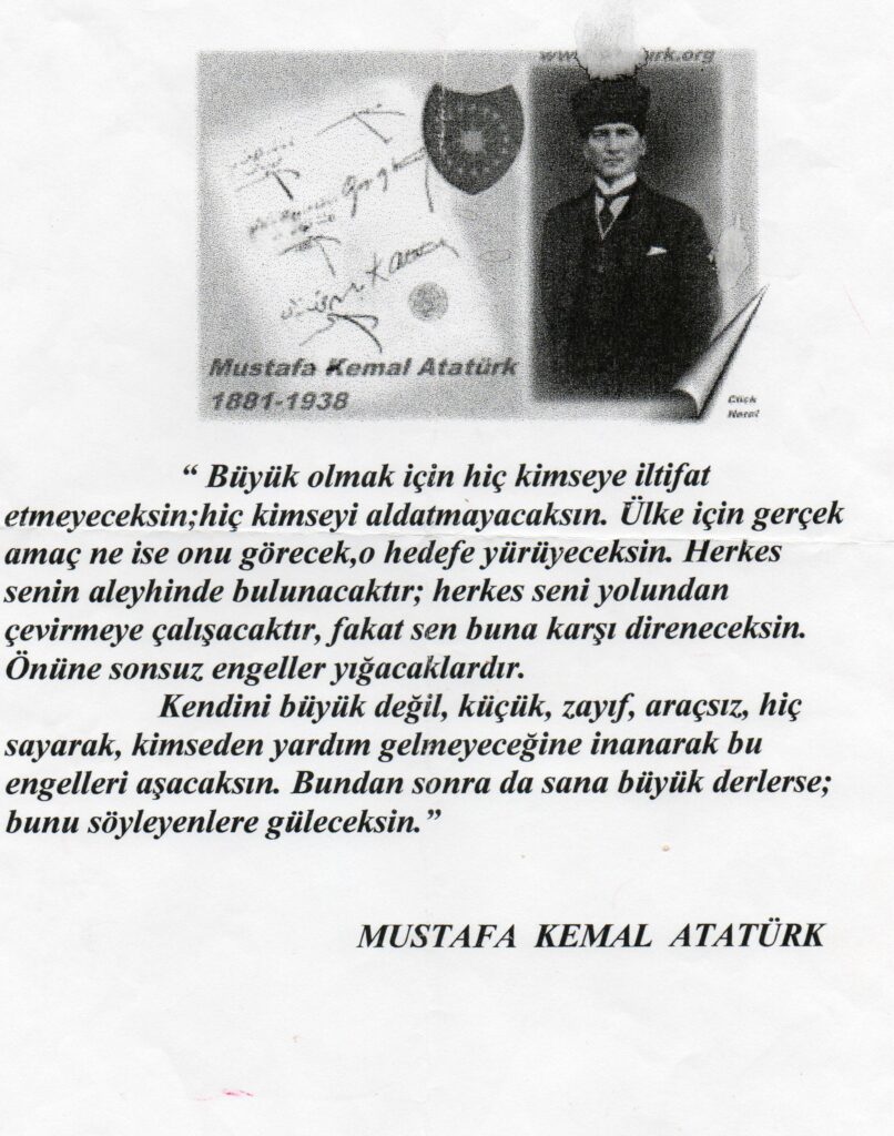 Atatürk’e ait sözler yer almaktadır. Türkiye Yardım Sevenler Derneği.