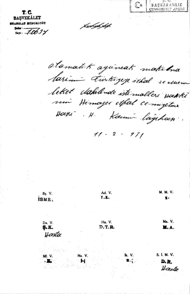 Otomatik oyuncak makinelerinin Türkiye’ye ithali hakkında kararname sureti yer almaktadır. Devlet Arşivleri Genel Müdürlüğü.