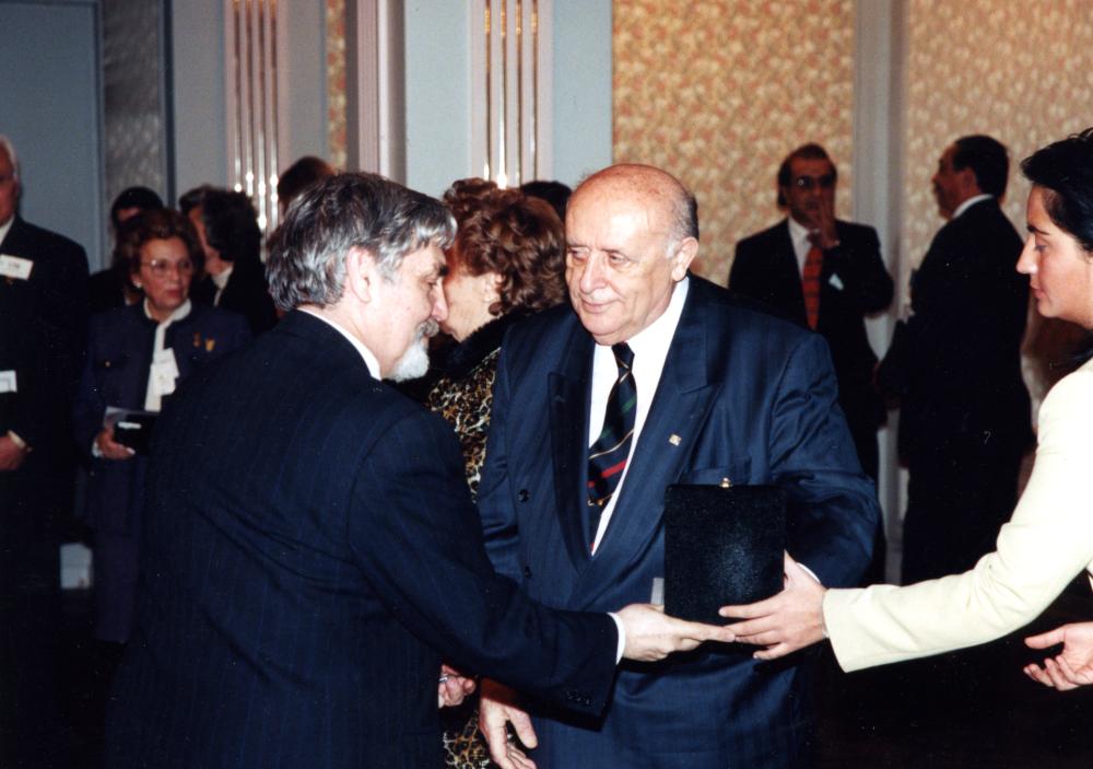 Ozan Sağdıç’ın Süleyman Demirel’den plaket aldığı fotoğraf yer almaktadır. Türkiye Yardım Sevenler Derneği.