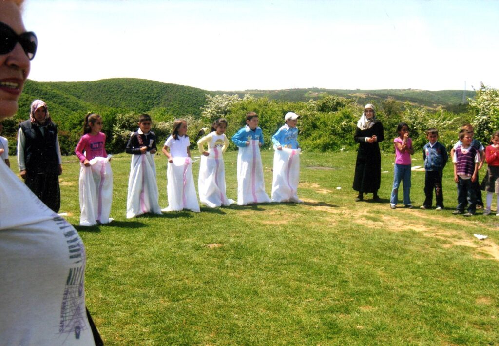 Pirinç Köyü Çuval Yarışı’na ait görüntü yer almaktadır. Türkiye Yardım Sevenler Derneği.