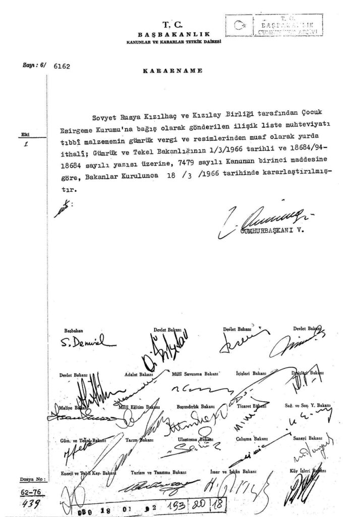Sovyet Rusya Kızılhaç ve Kızılay Birliği tarafından Çocuk Esirgeme Kurumu’na gönderilen malzemenin gümrük vergi ve resimlerinden muaf tutulmasına karar verildiği kararname ve tıbbı malzeme ile ilgili ek belge yer almaktadır. Devlet Arşivleri Genel Müdürlüğü.