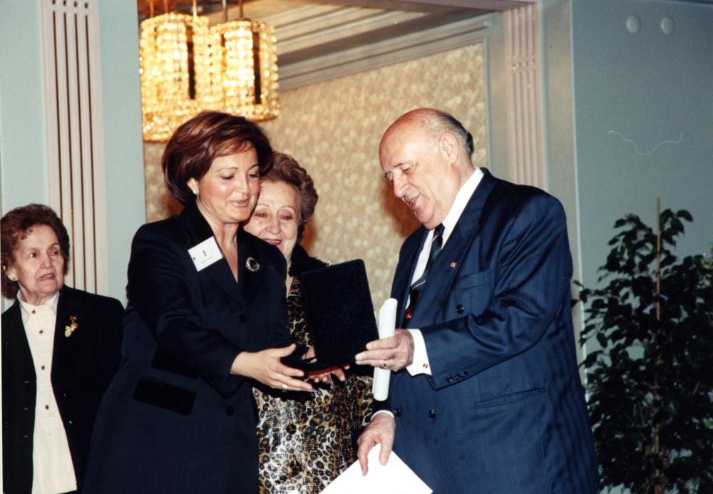 Süleyman Demirel’in Berna Yılmaz’a plaket vermesine ait fotoğraf yer almaktadır. Türkiye Yardım Sevenler Derneği.