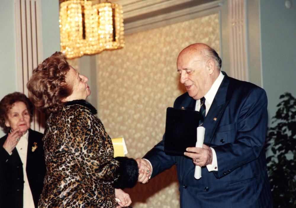 Süleyman Demirel’in Birsen Eldem’e plaket vermesine ait fotoğraf yer almaktadır. Türkiye Yardım Sevenler Derneği.