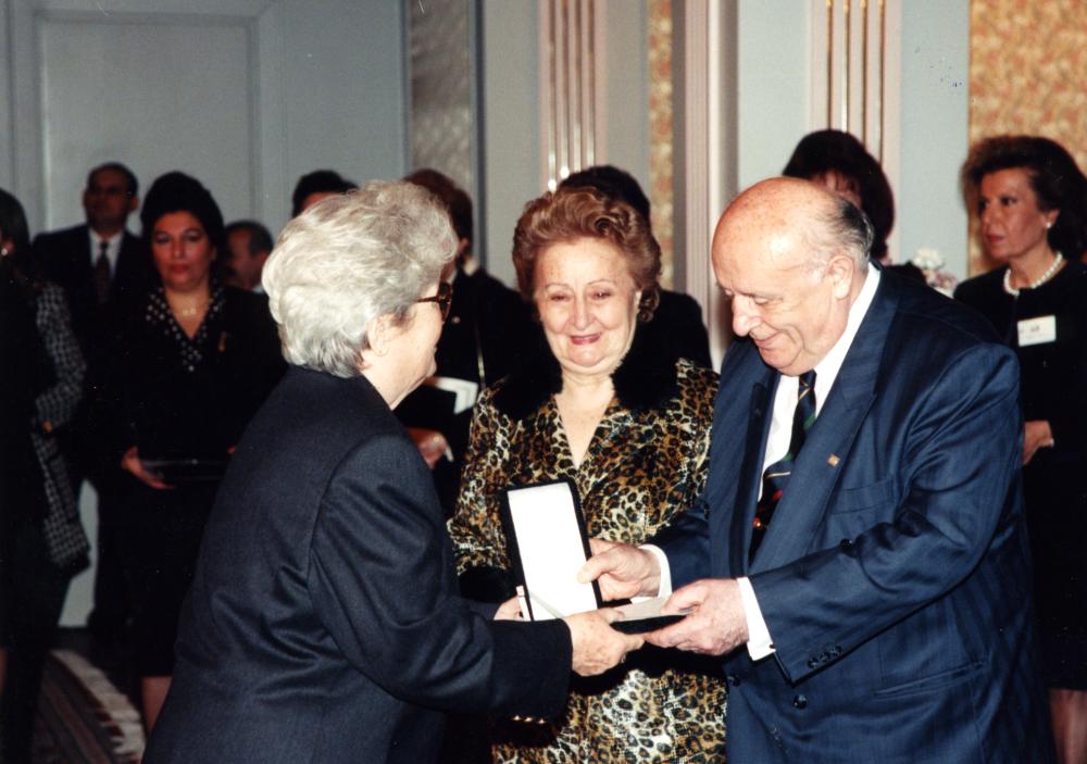Süleyman Demirel’in Fahriye Mührem’e plaket vermesine ait fotoğraf yer almaktadır. Türkiye Yardım Sevenler Derneği.