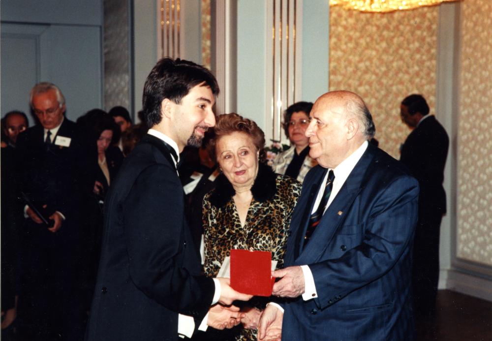 Süleyman Demirel’in HÜ Devlet Konservatuvarı Orkestra Şefi İbrahim Sözen’e plaket vermesine ait fotoğraf yer almaktadır. Türkiye Yardım Sevenler Derneği.
