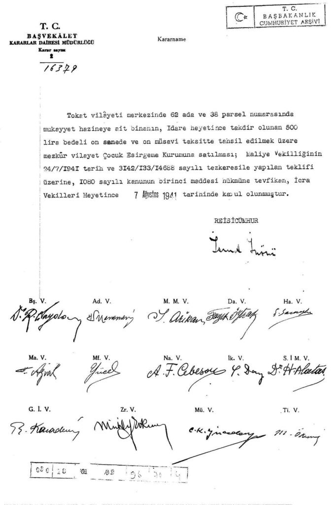 Tokat İli Merkezinde yer alan hazineye ait binanın Çocuk Esirgeme Kurumu’na satılmasına ait kararın verildiği kararname yer almaktadır. Devlet Arşivleri Genel Müdürlüğü.