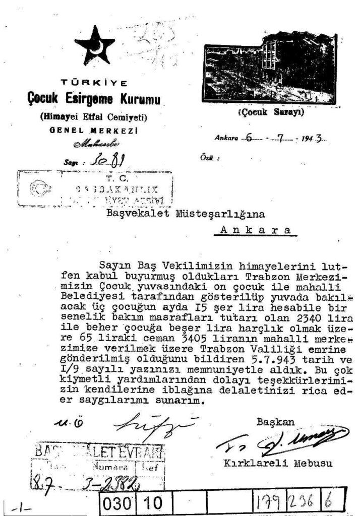 Çocuk Esirgeme Kurumu Başkanı Fuat Umay tarafından Başvekalet Müsteşarlığı’na Trabzon Çocuk yuvasında harcanmak üzere gönderilen maddi yardım hakkında gönderilen teşekkür yazısı yer almaktadır. Devlet Arşivleri Genel Müdürlüğü.