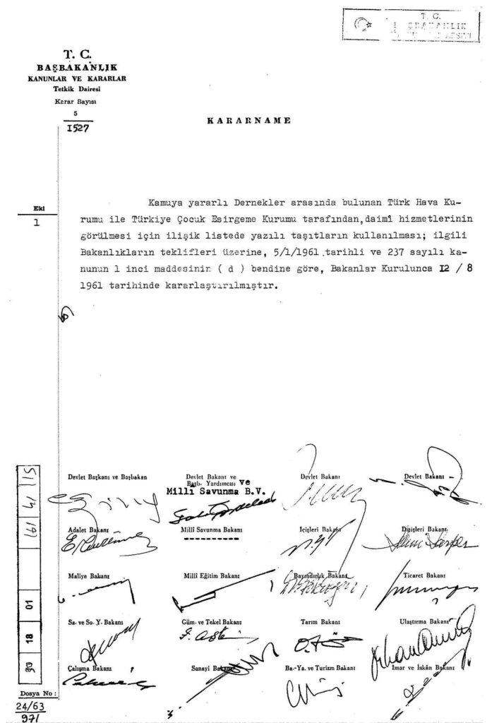 Türk Hava Kurumu ve Çocuk Esirgeme Kurumu’nun daimi hizmetlerinin görülmesi için İlişik listede yer alan taşıtların kullanılmasına karar verildiği kararname ve taşıt listesinin yer aldığı belge yer almaktadır. Devlet Arşivleri Genel Müdürlüğü.
