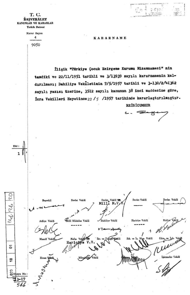 Türkiye Çocuk Esirgeme Kurumu Nizamnamesinin onaylanması kararının verildiği kararname yer almaktadır. Devlet Arşivleri Genel Müdürlüğü.