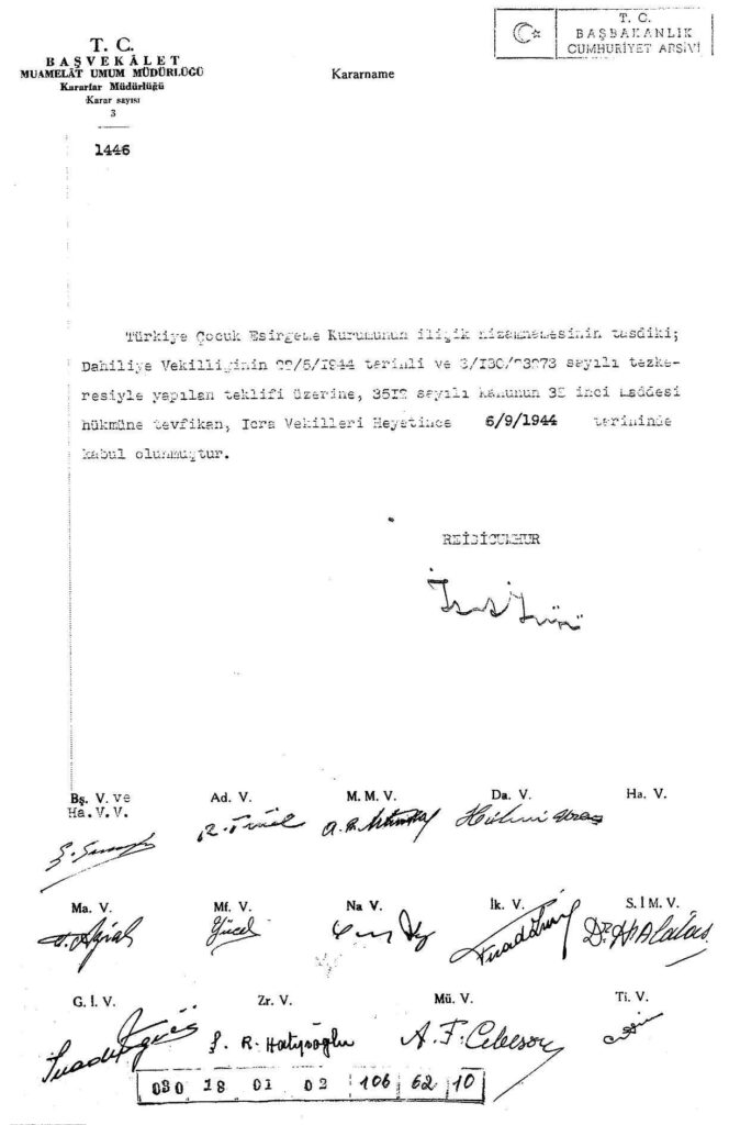 Türkiye Çocuk Esirgeme Kurumu Nizamnamesinin tasdiki Dahiliye Vekilliği’nin teklifi İcra Vekillerinin kararıyla kabul edildiğini belirten kararname yer almaktadır.