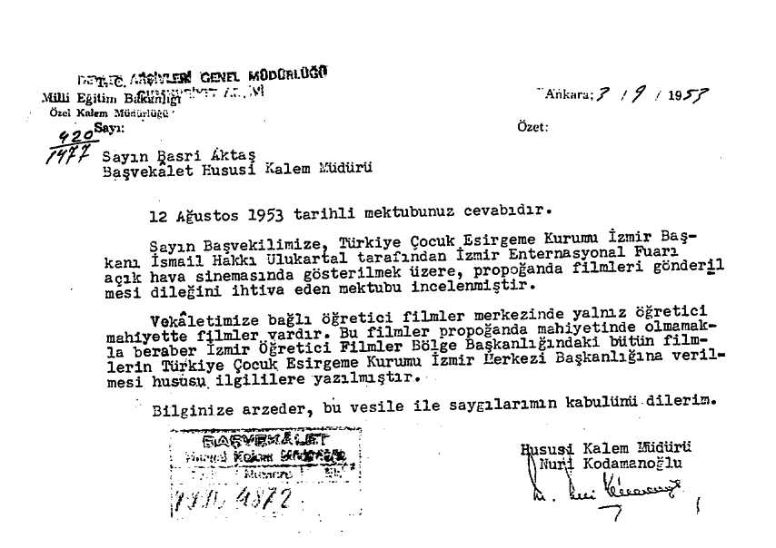 İzmir Enternasyonel Fuarı açık hava sineması gösterimi için yapılan yazışmalar yer almaktadır. Devlet Arşivleri Genel Müdürlüğü.