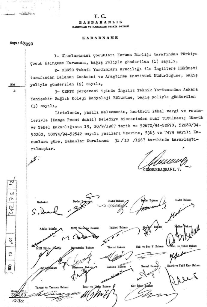 Uluslararası Çocukları Koruma Birliği tarafından Türkiye Çocuk Esirgeme Kurumu’na ve CENTO tarafından çeşitli kurumlara bağış yoluyla gönderilen malzemenin her türlü ithal vergi ve resimleriyle belediye hissesinden muaf tutulması kararının alındığı kararname ve malzemelerin listelerinin bulunduğu belgeler yer almaktadır.